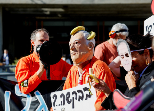 A small group of demonstrators gathered outside Monday’s Tel Aviv court hearing, some of them wearing orange prison-style jumpsuits and calling on Netanyahu to go to prison.