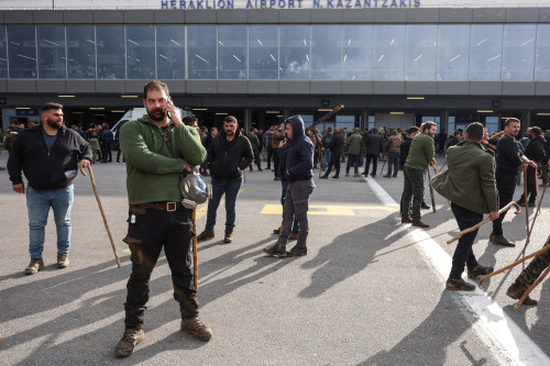 Protesters deployed thousands of trucks and tractors in at least 20 blockades across the country, local media said. Police fired tear gas at a group of protesting farmers who threw stones and forced their way onto the runway at Heraklion airport in Crete, halting air traffic.
